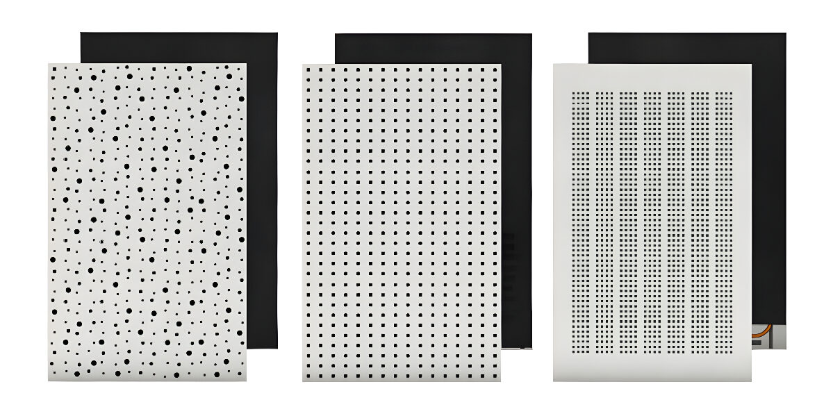 A 18 mm vastag gipszrost alapú akusztikus mennyezeti hűtő- és fűtőmodulok háromféle furatmintával szállíthatók: szórt perforáció, teljes perforáció vagy blokkperforáció.