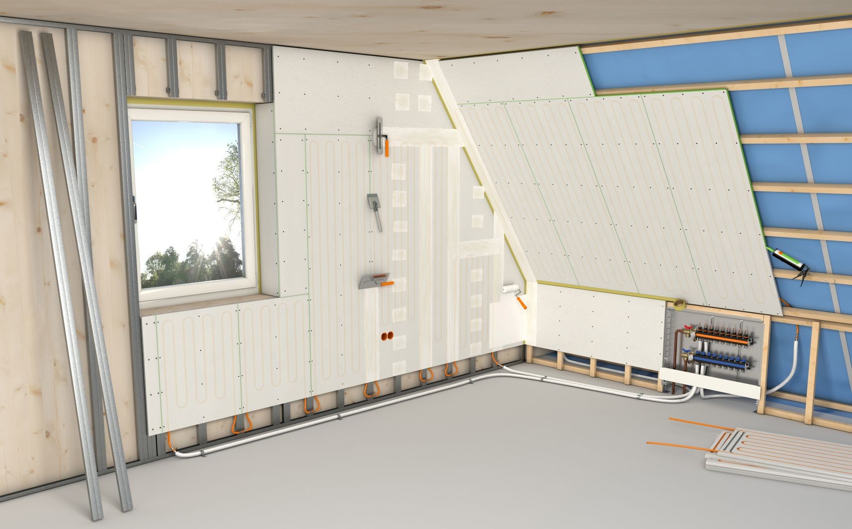 A mindössze 18 mm lapvastagságával a ModulWand rendszer rendkívül helytakarékos, így nem állhat semmi a tetőtér beépítésének útjába. Fűtés, hűtés és teljes falfelület – egyetlen munkafázisban!
