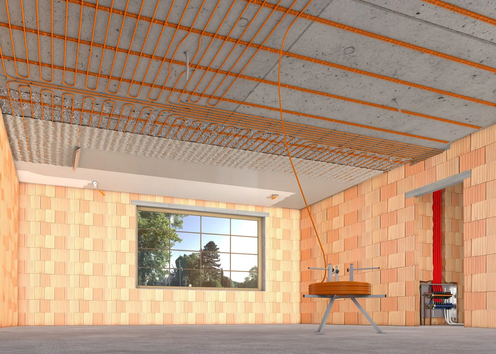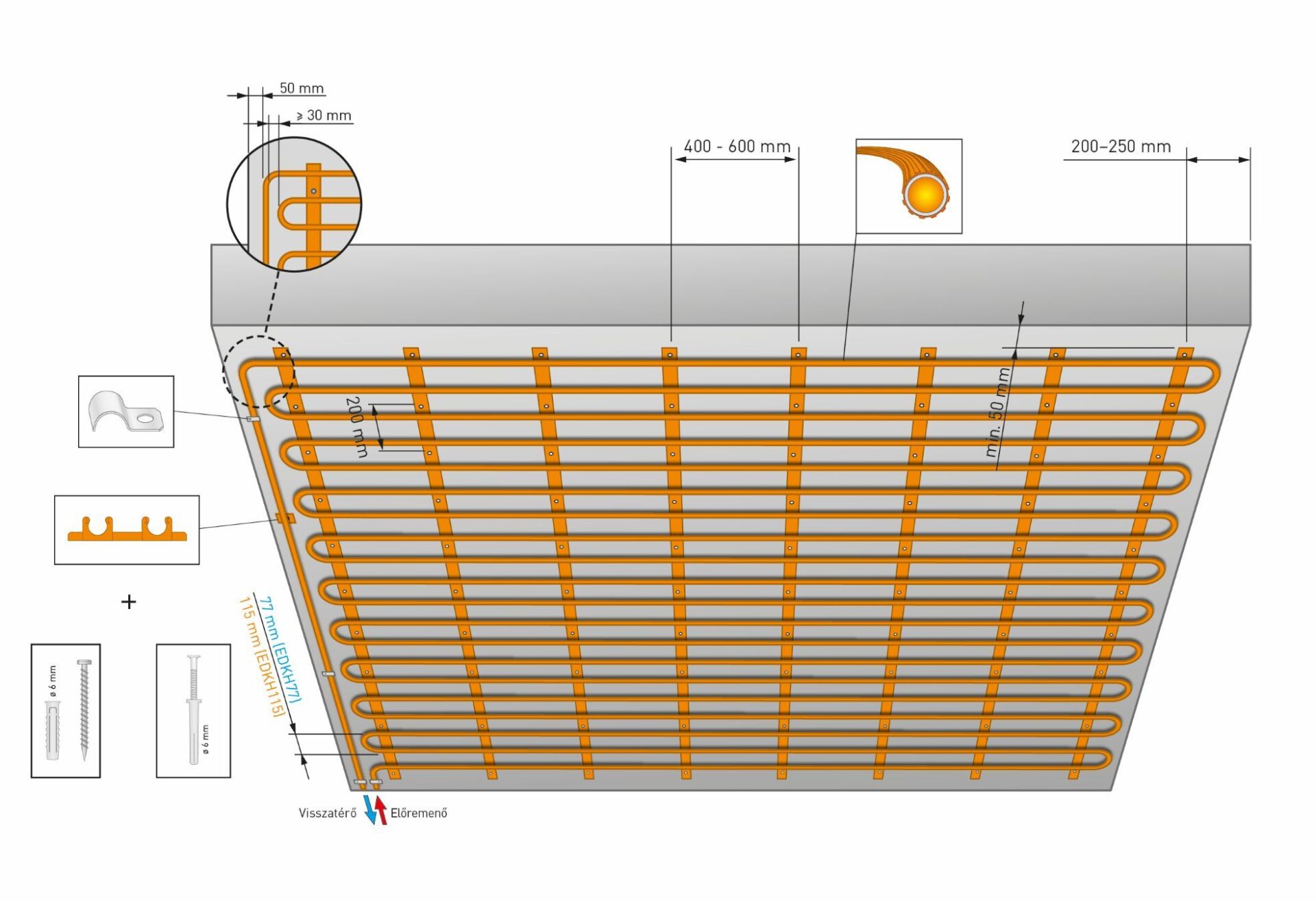 A csöveket VarioSínekre rögzítik a mennyezet alatt, majd teljes felületen vakolattal fedjük. A szerelés rugalmas, ívelt felületeken is megvalósítható és lehetővé teszi elektromos szerelvények vagy egyéb mennyezeti elemek egyidejű integrálását.