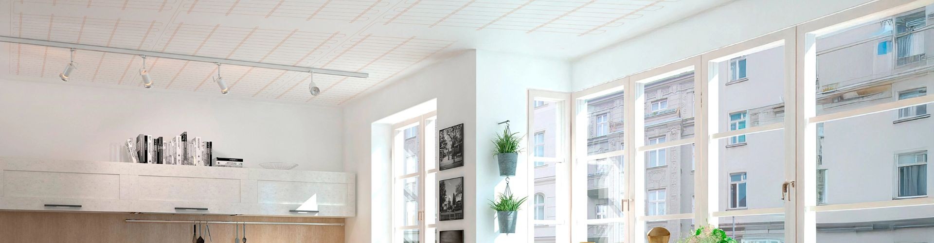 A fűtési és hűtési igények optimális lefedése érdekében a rendelkezésre álló mennyezetfelületet teljes egészében hűtő- és fűtőfelületként használjuk. Ezáltal csökkenthetők az előremenő hőmérsékletek – ami energiát takarít meg.